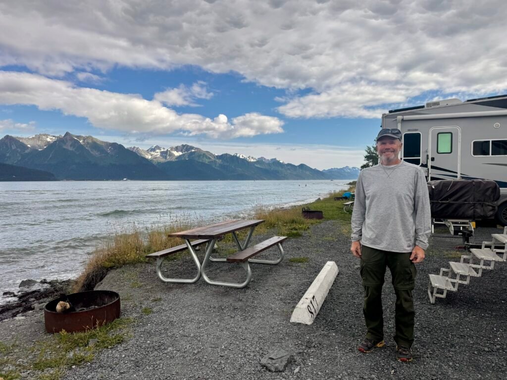We headed to Seward in the hopes of catching up with a friend and just narrowly missed him. No worries, we enjoyed many recommendations and quickly found accommodation at the waterfront park in Seward where the city has installed 100s of campsites. Yes, we were cheek-to-cheek with other RVs but it was part of the experience of enjoying the enormous beauty of Ressurection Bay and the surrounding Mountains, Glaciers and sea life.
